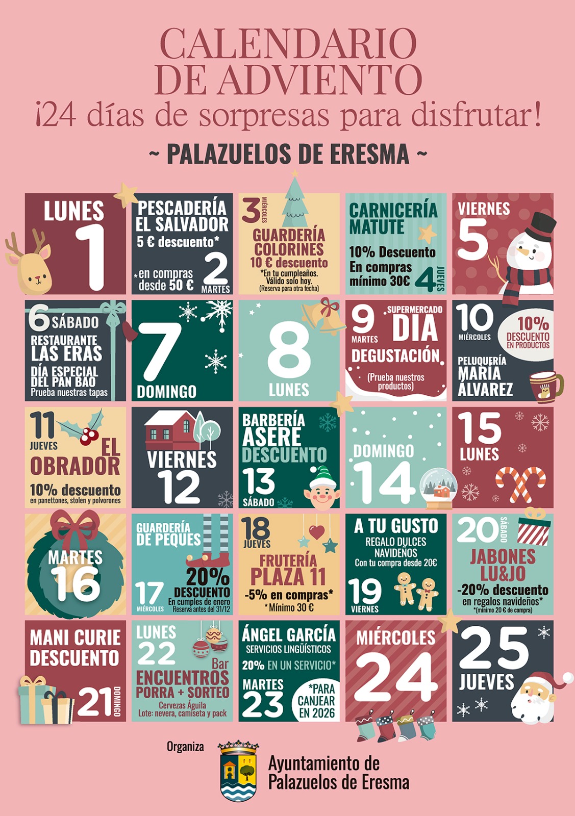 El Ayuntamiento de Palazuelos de Eresma presenta el Calendario de Adviento Empresarial 2025, una iniciativa que reúne a empresas locales de sectores muy diversos. Cada día, una de ellas ofrece una acción especial: descuentos, degustaciones, regalos, sorteos o propuestas exclusivas.